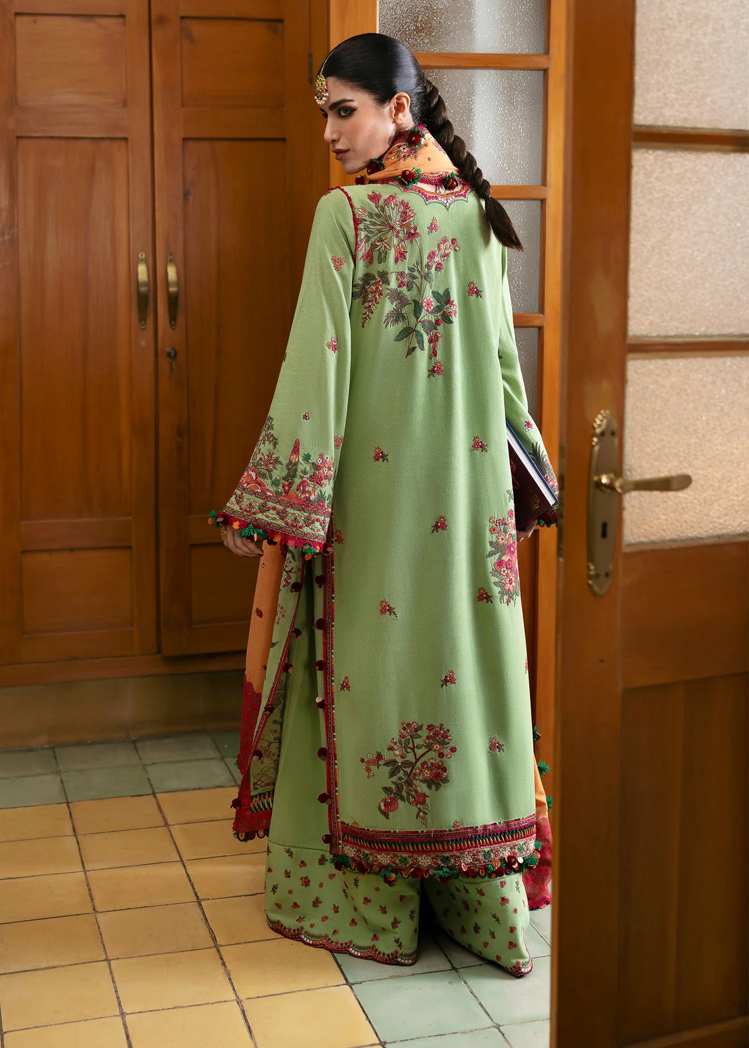 This parrot green karandi ensemble brings together exquisite craftsmanship and timeless charm.The intricate floral embroidery graces every inch,forming a pattern that exudes sophistication.The same-tone embroidered trousers enhance the coordinated feel,while a contrasting karandi shawl adds depth and a stylish edge.with every detail thoughtfully crafted,this outfit is a standout addition to your winter wardrobe-a truly refined choice for the discerning fashion enthusiast.
