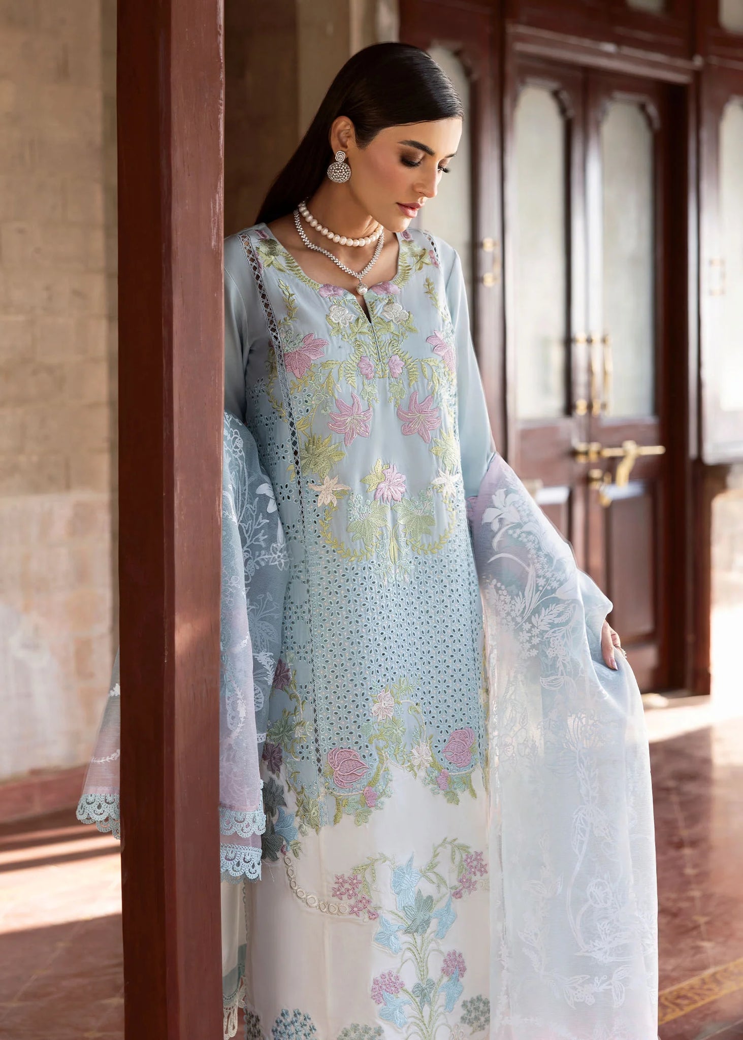 A design that is the epitome of feminine grace, a neckline embroidered in blooming lotuses and lilies in shades of lavender and blush like a soft summer morning on a luminous sky blue cutwork canvas. The blue cutwork front is finished with a flowy border that connects it to the ivory daman. Feminine and elegant this tonal design is a head turner! The duppatta, a breezy cotton net is hand printed with bouquets and Ribbons.