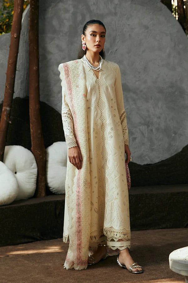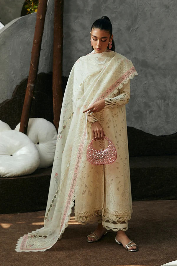 - The organza dupatta has laser cutting and embroidered borders and print.